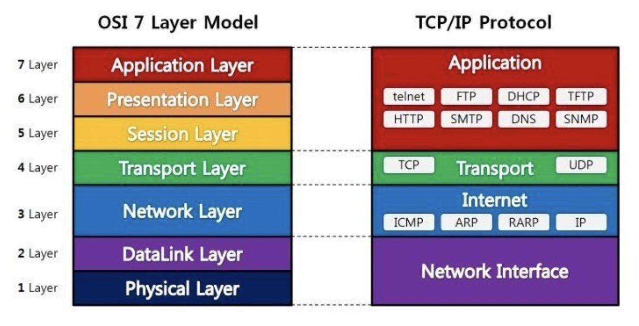 물리계층 - 데이터 링크계층 - 네트워크 계층 - 전송 계층 - 세션 계층 - 표현 계층 - 응용계층