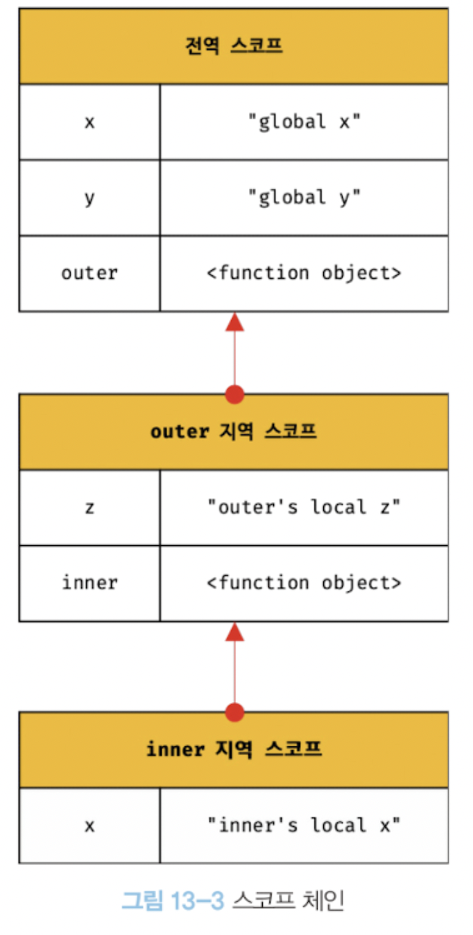 이때 outer 함수가 만든 지역 스코프는 inner 함수가 만든 지역 스코프의 상위 스코프다.