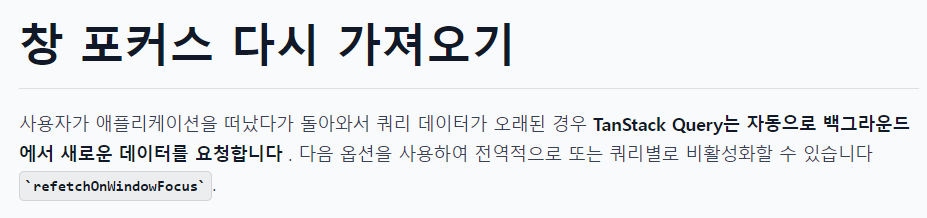 refetchOnWindowFocus 옵션은 굳이 새로고침을 하지 않아도 캐시의 상태가 stale인 경우 window에 focus를 하면 (인터넷 탭 이동 or 다른 앱 사용 후 창으로 되돌아오기) 자동으로 refetch가 실행된다.